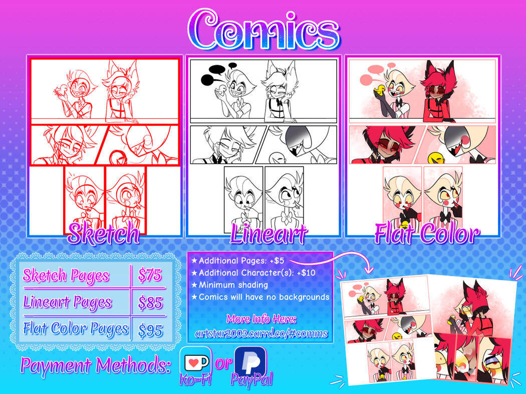 Colored comic pages may contain minimum shading, if asked by the client.